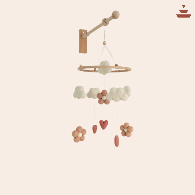 Delicately handcrafted from pure New Zealand wool, this felt baby mobile features soft clouds, blooming flowers, and heart-shaped charms in a soothing palette of ivory, blush, and peach. Designed to gently sway above your baby’s crib or changing table, it creates a peaceful, nature-inspired ambiance in any nursery setting.