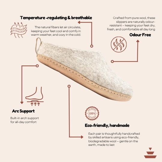 Felt slippers are carefully handcrafted using premium wool, offering exceptional warmth in cold weather, making them ideal for winter or chilly environments. The Himalayan Aesthetics grey wool slippers are designed to be highly breathable, allowing moisture to escape, which helps prevent foot odor and maintains a healthy environment for your feet. Plus, you can select your preferred size for the perfect fit! Each pair is completely handmade by skilled craftswomen, making our slippers truly unique and valuable. These indoor slippers are the perfect companion for winter, providing cozy warmth and protecting your feet from cracking. Our handmade wool slippers are not only comfortable and warm but also eco-friendly and sustainable. They are a popular choice for individuals of all ages and lifestyles, delivering the perfect blend of comfort and style.