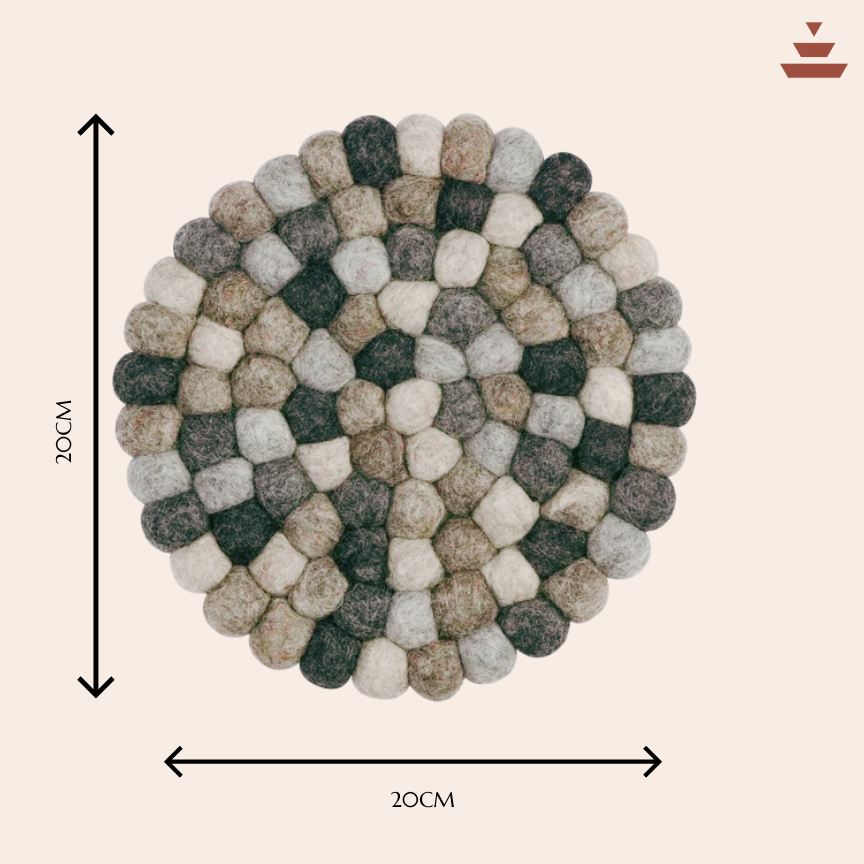 The round trivet from Himalayan Aesthetics is handcrafted using eco-friendly, multicolored wool felt balls. Each piece is meticulously hand-stitched for durability and longevity. Designed to protect your countertops and tables from hot pots and pans, this wool felt trivet also provides a cushioned surface to prevent scratches and damage. The natural heat-insulating properties of wool offer excellent protection while bringing a warm, cozy touch to your home. Measuring 20 cm in diameter, with 2 cm felt balls, this trivet is perfect for enhancing your kitchen decor, impressing guests, or gifting someone special.